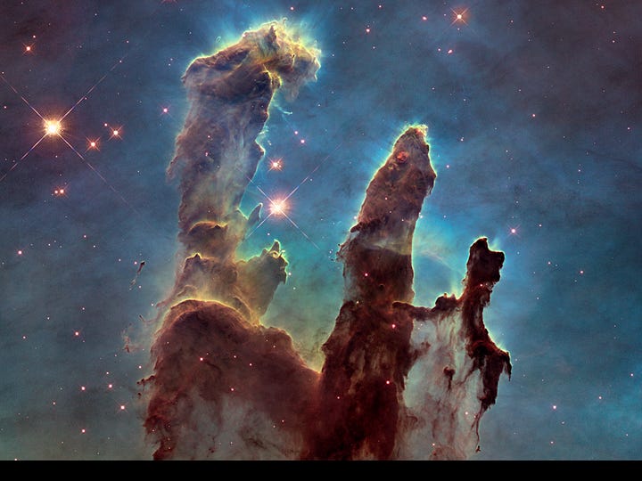 Chris: Absolutely. And the answer is: a nebula is a giant cloud of dust and gas in space. Stars are born in nebulas. Therefore and furthermore, certain types of nebulas are known in the astronomical vernacular as star nurseries. I refer our Dear Gentle Critters and our Dear Gentle Readers to our opening photograph of the nebula Pillars of Creation. The end. And another thing, did you know that Pillars of Creation is a small part of an even larger nebula, the Eagle Nebula. Question mark. Question mark.