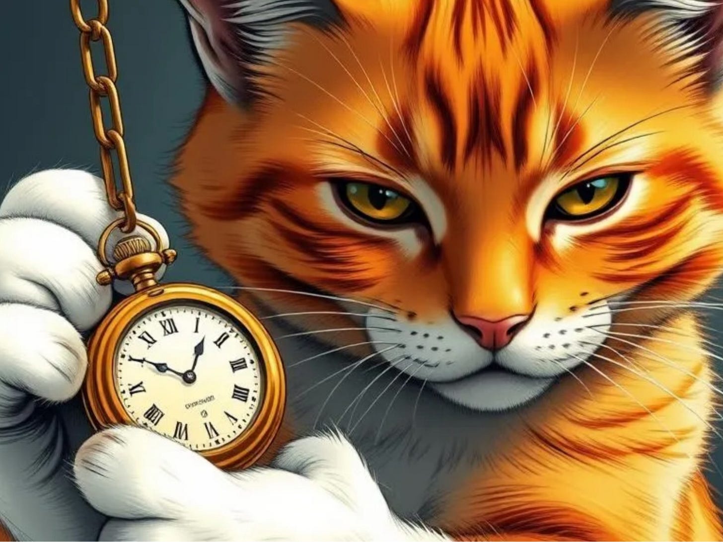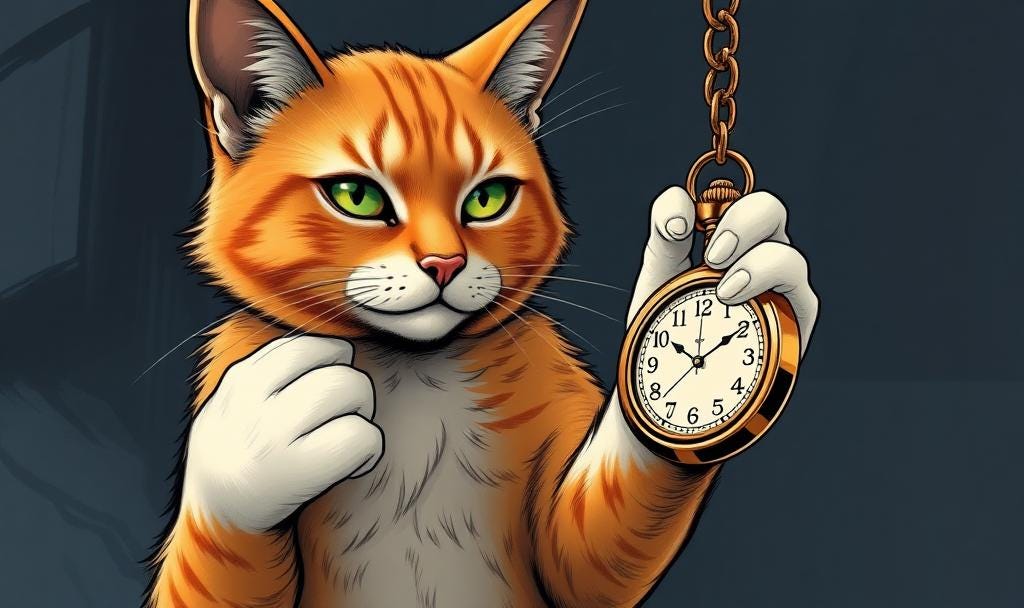 “When you are ready. Please. Proceed,” mewed Jasper Kitten, setting the pocket watch in motion. “And remember. You. Are. Getting. Very. Very. Sleepy.”